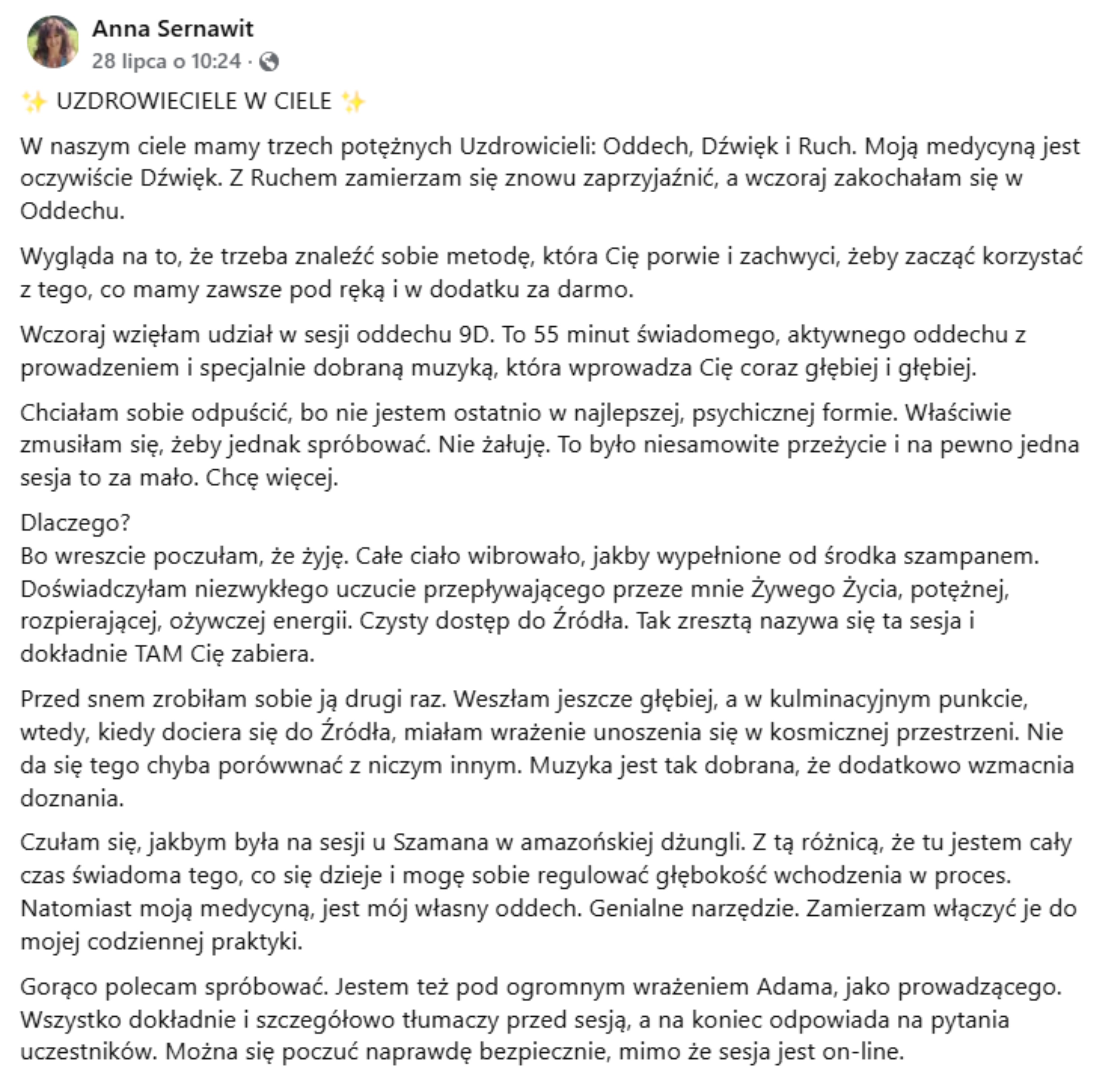 - Dla każdego, niezależnie od poziomu doświadczenia – 9D jest odpowiedni zarówno dla osób rozpoczynających swoją podróż rozwojową, jak i dla tych, którzy mają już doświadczenie w pracy z oddechem lub terapiami transformacyjnymi.